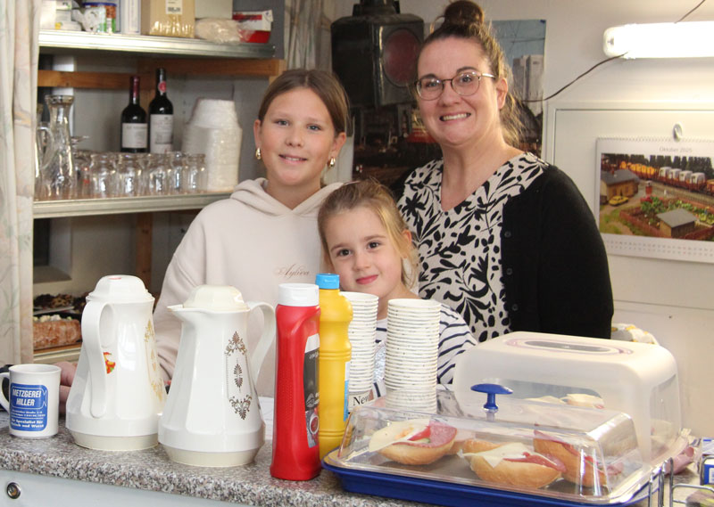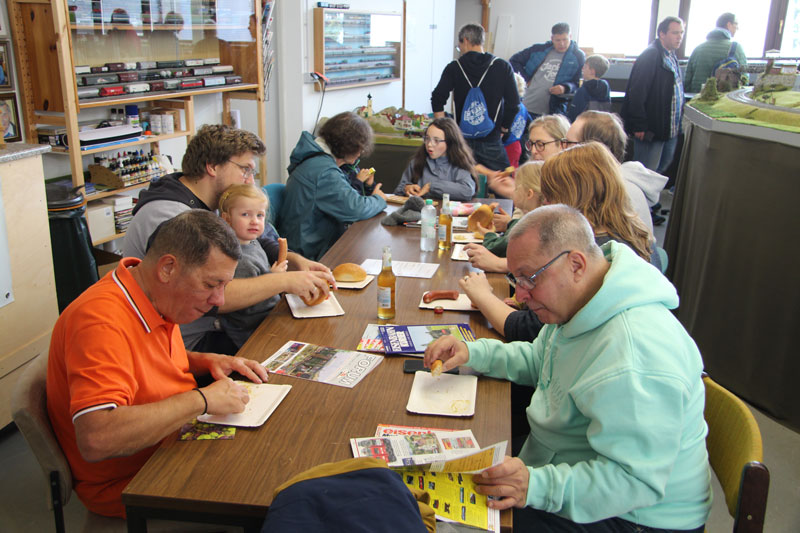 Für das leibliche Wohl wurde mit Getränken, Kaffee, Kuchen, belegten Brötchen und warmen Würstchen bestens gesorgt, wobei an den Tischen Modellbahnzeitschriften zum Schmökern ausgelegt waren (Modelleisenbahner, MIBA usw.).