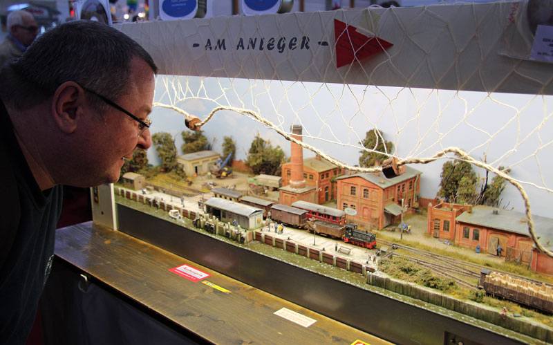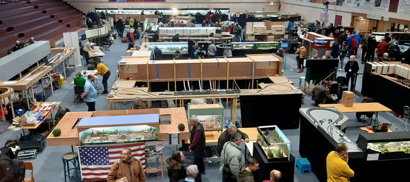 Hier erfreut sich Jürgen an einem solchen Schaukasten in Spur N, gezeigt auf der Messe in Sinsheim 2015. So kamen Jürgen und Reinhard zu dem Schluss: Wir werden eine jederzeit erweiterbare, leicht auf- und abbaubare Einhausung für unsere ein-und zweigleisigen, 1,20 m langen, geraden H0-Module bauen ! Dazu rechts und links ein Modul mit einer 180°-Kurve die zu enem hinter der Einhausung gelegenen mehrgleisigen Schattenbahnhof führt, dessen Weichen automatisch gesteuert werden. Damit könnte man sich dann für überregionale in- und ausländische Ausstellungen bewerben und diese ggf. mit geringem personellen Aufwand durchführen. Dies auch öfters bei der gleichen Ausstellung in Folgejahren, weil man die schon gezeigten einfach gegen noch nicht gezeigte, ggf. neu gebaute Module auswechseln kann. Dezember 2022 Wie eine Bestätigung für den eingeschlagenen Weg war der Besuch der Ausstellung "La Fête du Train" in Meursault / Frankreich: Hier waren die gezeigten Schauanlagen fast ausschließlich eingehaust und mir einem dahinter (Bildmitte) oder seitlich (z.B. unten rechts) gelegenen Schattenbahnhof versehen.