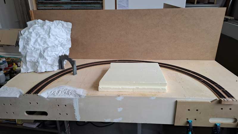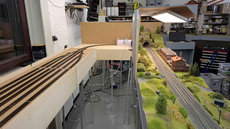 Stand am 18.02.2026: Probeaufstellung der bisher fertigen neuen Teile (Umfahrungen rechts und links sowie des Schattenbahnhofs) um die Dimension des fertigen Objektes mal vor Augen zu haben.
