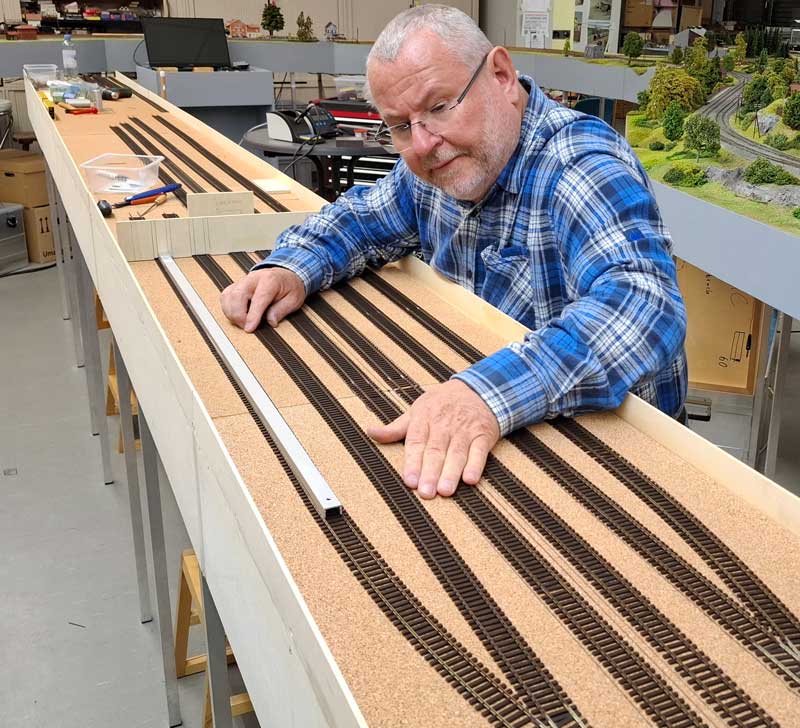 Stand am 27.01.2025: Seit Mitte 2024 wurde ein zunächst 5-teiliger Schattenbahnhof zusammengebaut, bei dem Jürgen mit voller Konzentration an der Gleisverlegung und später an der Elektrik arbeitet. Er kann wegen der Modulbauweise parallel zur Schauseite entweder auf mindestens 3 Teile verkürzt oder durch den Bau weiterer Mittelteile verlängert werden.