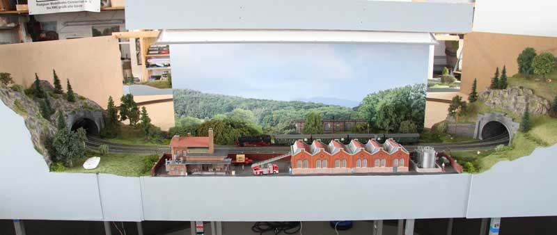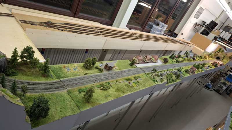 Stand am 15.03.2025: Für unsere Frühjahrsausstellung haben wir zur Demonstation des Einhausungsprojektes den jeweiligen Schauteil der beiden Verbindungskästen fertig gestaltet, dazwischen ein Modul ( Nr. 119 ) aufgestellt und dies mit einem fotorealistischen Hintergrund und der Beleuchtung versehen.