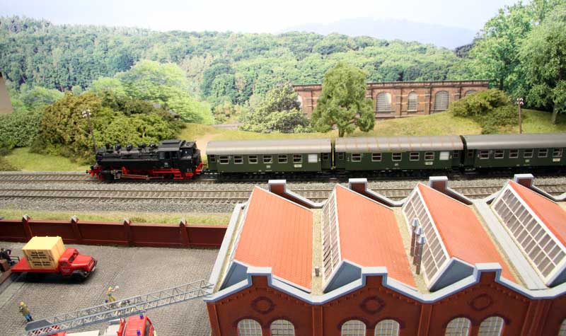 GleisplanIm Prinzip handelt es sich um ein Oval, vorne bestehend aus mindestens 3, in der Regel aber 5 1,20 m langen, geraden, ein- oder zweigleisigen FREMO-H0-Modulen (Schauseite), hinten aus einem Schattenbahnhof mit 3 Gleisen in jede Richtung und zwei Seitenteilen als Verbindung. Das stellen der Weichen des Schattenbahnhofs soll durch eine Schattenbahnhofssteuerung automatisiert werden.