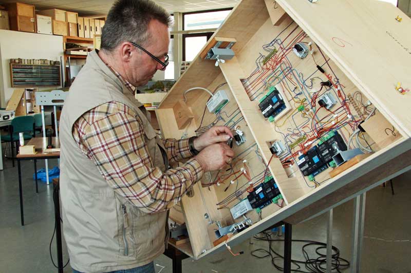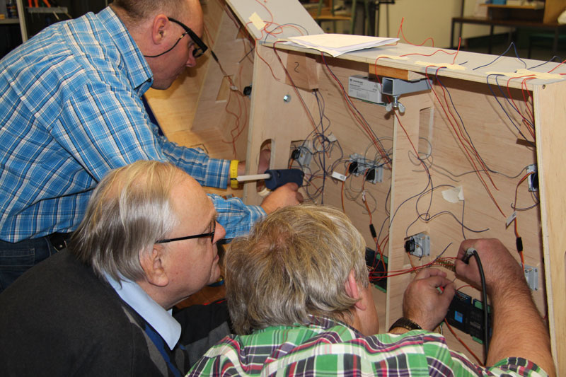 Deshalb haben Bodo, Michael B. und Detlef einen auf Rollen beweglichen Schrank (im Bild rechts) gebaut, bei dem alle Bedienelemente fallsicher fest eingebaut sind und der jeweilige Bediener stehend immer beim stellen der Weichen und Signale den vollen Überblick über den Bahnhof hat. Fertigstellung demnächst !