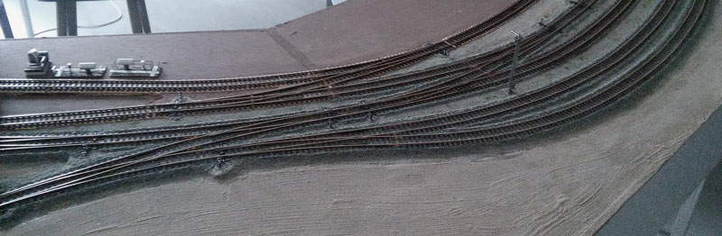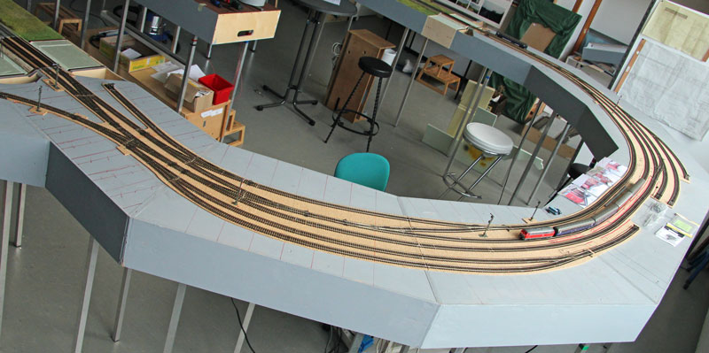 Stand am 09.09.2015: "Bergfest". Die Elektrik der linken Hälfte (siehe Gleisplan oben) des Bahnhofs ist montiert und alles funktioniert einwandfrei ...