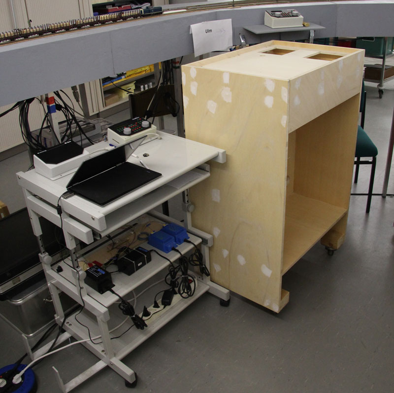 Stand am 01.02.2017: Bisher wurde als Platz für die Steuerelemente der H0-Anlage und besonders für die des Bahnhofs Gessertshausen hilfsweise ein feststehender und wie sich schnell herausstellte, zu niedriger Computertisch (links im Bild) benutzt.