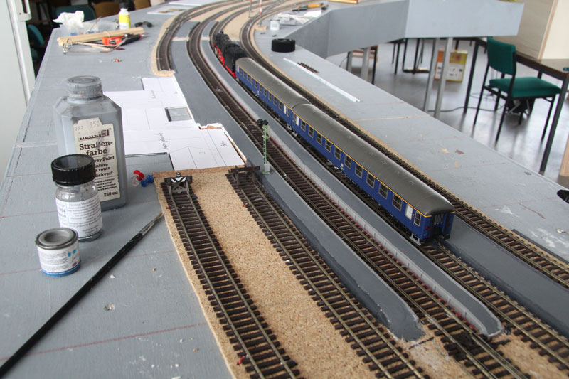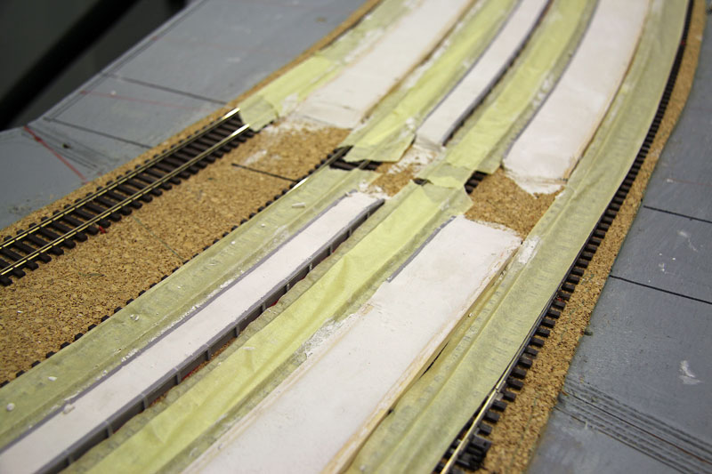 Stand am 05.04.2017: Auf den Kork wird eine Gipsschicht aufgetragen. Um deren Verschmutzung zu vermeiden, wurden die Gleise vorher mit Malerkrepp abgeklebt.