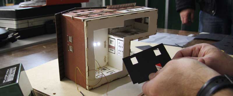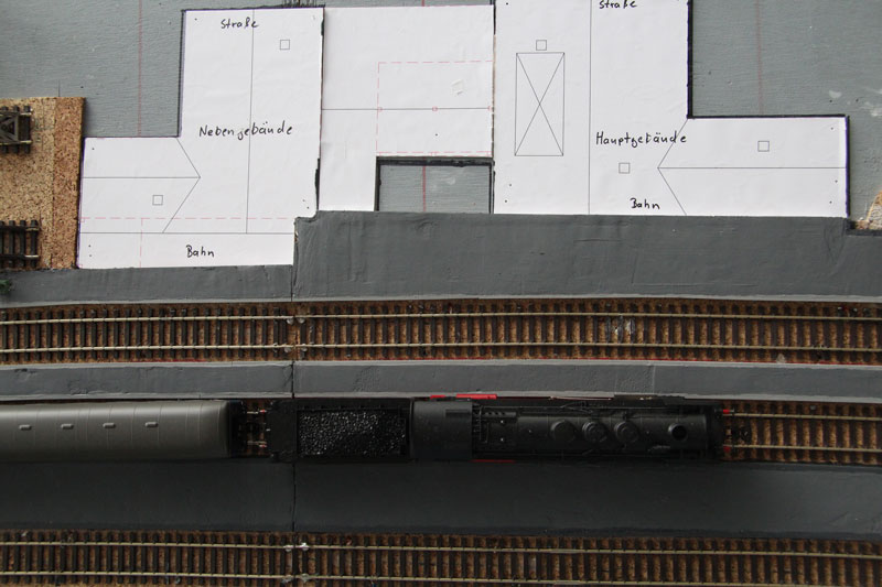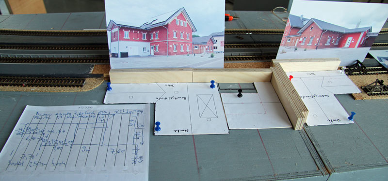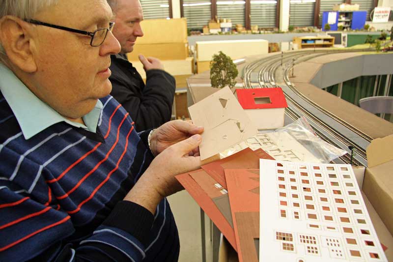 Fortschritte auch beim Bahnhofsgebäude. In Zusammenarbeit mit der Firma MKB Modellbau sollen der Bahnhof und weitere Gebäude aus Karton gelasert werden. Schon länger ist Detlef zur Kostenersparnis dabei, mit zeitaufwendiger Arbeit die dafür notwendigen Einzelteile zur Weitergabe an MKB selbst am Computer zu konstruieren. Zwischendurch hat er probehalber schon mal einige Grundkonstruktionsteile ausgedruckt, aus Karton ausgeschnitten, zusammengesteckt und an ihren vorgesehenen Platz auf dem Bahnhofsmodul gestellt. Die Sache scheint zur Freude des Vereinskassierers was zu werden !
