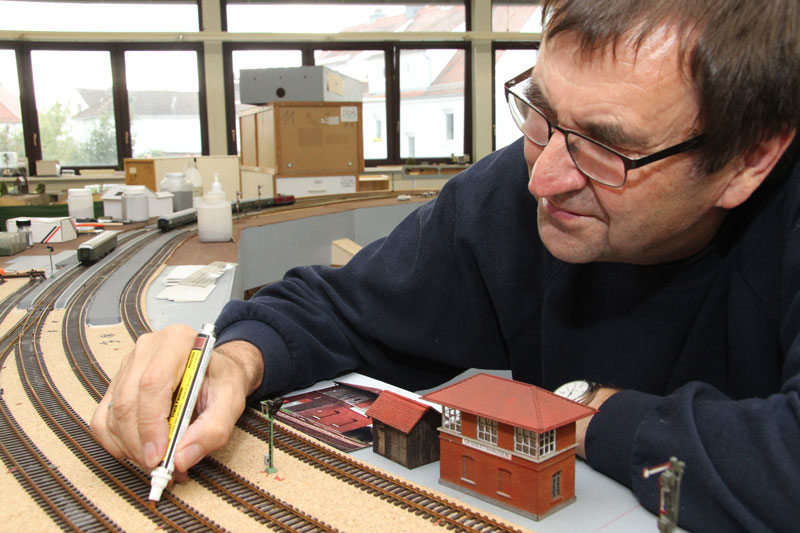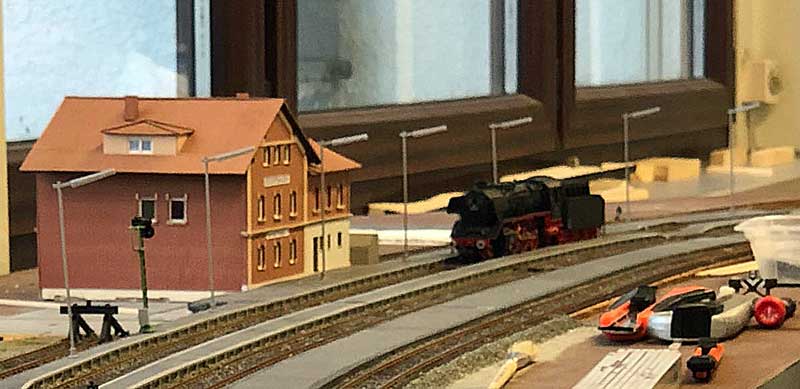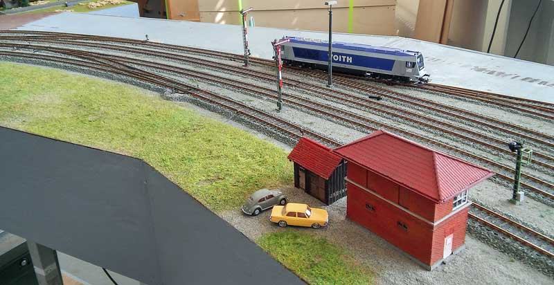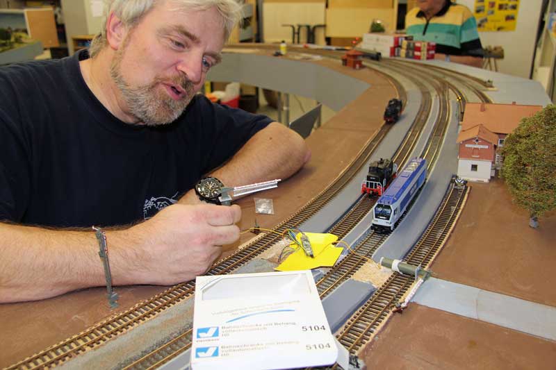 Die Schrankenanlage ist eingebaut und angeschlossen. Stand am 25.04.2018: Als Schrankenanlage für den Bahnübergang soll die 5104 von Viessmann verwendet werden. Stand am 11.04.2018: Nach der Frühjahrsausstellung gehen die Arbeiten am Bahnhof weiter. Zur Zeit ist Bodo dabei, die Beleuchtungsbirnchen der Weichenantriebe durch LED's zu ersetzen, weil diese ein "besseres Licht" machen und dabei keine Hitze abgeben. Stand am 18.02.2018: Die restlichen Dachteile sind geliefert worden und ergänzt. Sieht erwatungsgemäß gut aus !