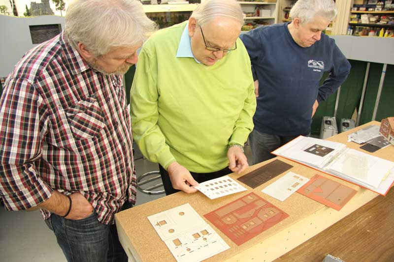 Stand am 02.01.2019: Detlef (Mitte) war fleißig bei der Konstruktion weiterer Bahnhofsteile, die inzwischen auch fertig gelasert sind.