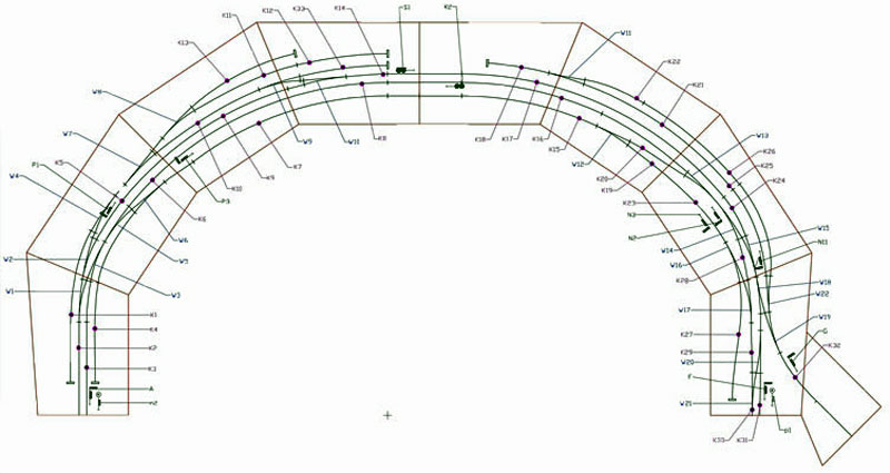 Der Gleisplan dieses Bahnhofs erscheint uns zudem günstig dafür, ihn als 180°-Kurve mit 2 Meter Radius auszulegen; dies wiederum als Gegenpol zu unseren bereits vorhandenen zweigleisigen Kurvenmodulen (Module Nr. 100 und 103 bis 106) die, hintereinander gestellt, ebenfalls eine solche 180°-Kurve bilden. |