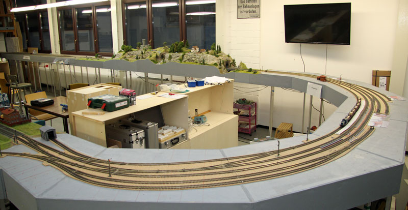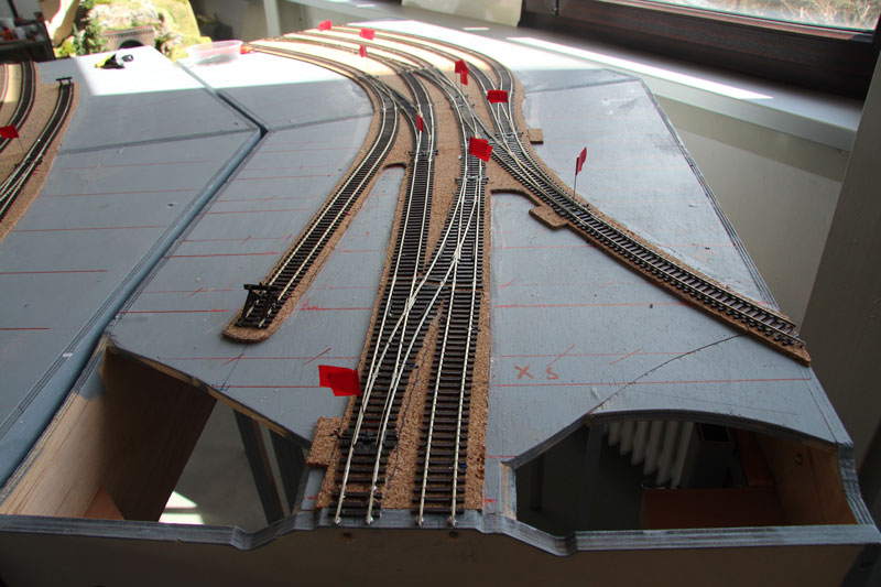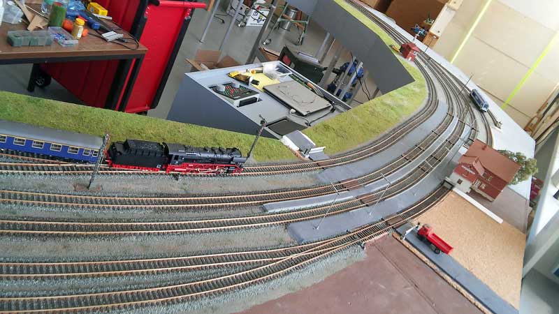 Stand am 09.09.2015: "Bergfest". Die Elektrik der linken Hälfte (siehe Gleisplan oben) des Bahnhofs ist montiert und alles funktioniert einwandfrei ...