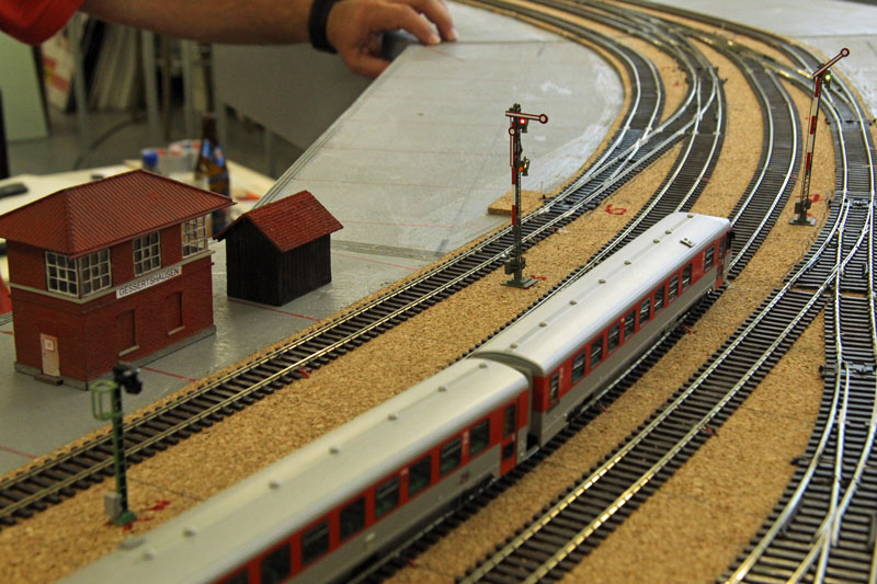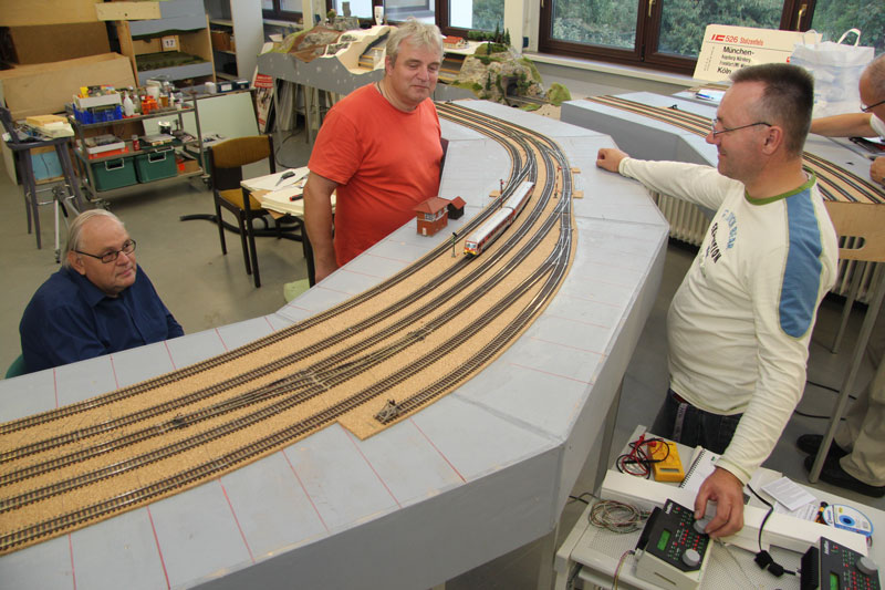 ...auch die Signale. Da kommt Freude auf. Stand am 17.06.2015: Die ersten beiden Signale sind aufgestellt. Stand am 10.06.2015: Sieht etwas wirr aus, funktioniert aber nach etlichen Probefahrten, Fehler- und Kurzschlußsuchen letztendlich einwandfrei. Stand am 01.04.2015: Die "Elektrisierung" der einzelnen Komponenten beginnt; zuerst ist die Einfahrt aus Richtung Augsburg dran. Stand am 04.03.2015: Alle Gleise und Weichen sind komplett verlegt. Um bei den Gleisen nicht so viele Trennstellen zu haben und für den einfacheren Transport sind jeweils zwei der acht Hauptstreckenmodule fest miteinander verbunden. Stand am 28.01.2015: Stand am 14.01.2015: Stand am 07.01.2015: Stand am 10.09.2014: Der Einfahrtsbereich aus Richtung Augsburg hat schon Gestalt angenommen. Stand am 16.07.2014: Nach längerer Wartezeit ist nun das komplette Material für die Weichenantriebe und deren Steuerung geliefert worden. Für einen Test des gesamten Systems haben Michael B. und Bodo nach längerem, intensiven Studium der Bauanleitung einen Antrieb mit Servo zusammengefummelt und ... ![]()