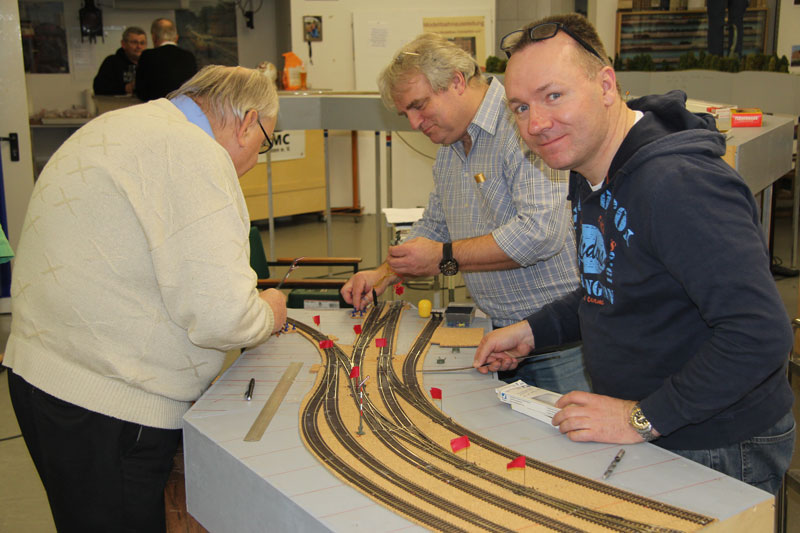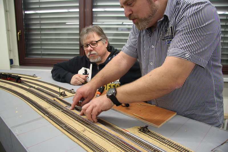 ![]() Dem festen Einbau der ersten Weiche mit Antrieb steht nun nichts mehr im Wege. Die Spannung steigt! Stand am 14.05.2014: Am Ende soll schließlich alles dauerhaft so gut funktionieren wie bei unserem Bahnhof Obertshausen. Stand am 16.04.2014: Stand am 05.03.2014: ![]() Um die Korkgleisbettung passend zuzuschneiden, werden die Gleise und Weichen nach Plan verlegt. Stand am 22.01.2014 Der Gleisplan wird auf die Module übertragen. Stand am 19.06.2013 Die Module stehen auf eigenen Füßen Stand am 15.05.2013 Auch der letzte Kasten ist fertig und die versammelte Mannschaft bestaunt die Außmaße des neuen Bahnhofs. Stand am 08.05.2013 Richtig gezählt! 8 Kästen sind fertig, einer fehlt noch. Stand am 17.04.2013 Schon drei Modulkästen sind fertig zusammengebaut. Erste Stellprobe mit Gleismaterial. ![]() Der Zusammenbau der neun Einzelteilmodule hat begonnen. Als Erstes haben sich Bodo und Michael das kleinste Teil vorgenommen. Stand am 12.12.2012 |