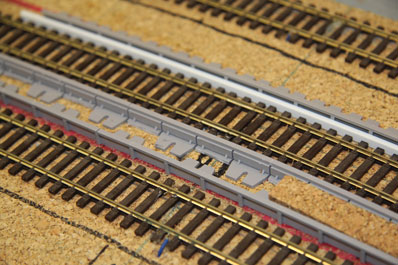 Nachdem der Bahnhof für die Frühjahrsausstellung kurzzeitig abgebaut war, geht es weiter mit der Installation der Bahnsteige. Die Bahnsteigkanten werden dabei mit entsprechend dimensionierten Evergreen-Profilen im nötigen Abstand von den Gleisschwellen gehalten und festgeklebt, damit vorbeifahrendes Rollmaterial nicht daran schleift. Der innere Zwischenraum wird zunächst mit Kork aufgefüllt.