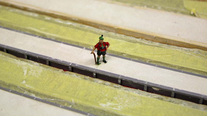 Stand am 05.04.2017: Auf den Kork wird eine Gipsschicht aufgetragen. Um deren Verschmutzung zu vermeiden, wurden die Gleise vorher mit Malerkrepp abgeklebt.