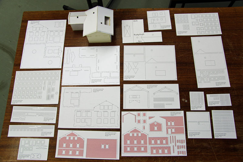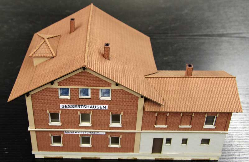 Fortschritte auch beim Bahnhofsgebäude. In Zusammenarbeit mit der Firma MKB Modellbau sollen der Bahnhof und weitere Gebäude aus Karton gelasert werden. Schon länger ist Detlef zur Kostenersparnis dabei, mit zeitaufwendiger Arbeit die dafür notwendigen Einzelteile zur Weitergabe an MKB selbst am Computer zu konstruieren. Zwischendurch hat er probehalber schon mal einige Grundkonstruktionsteile ausgedruckt, aus Karton ausgeschnitten, zusammengesteckt und an ihren vorgesehenen Platz auf dem Bahnhofsmodul gestellt. Die Sache scheint zur Freude des Vereinskassierers was zu werden !