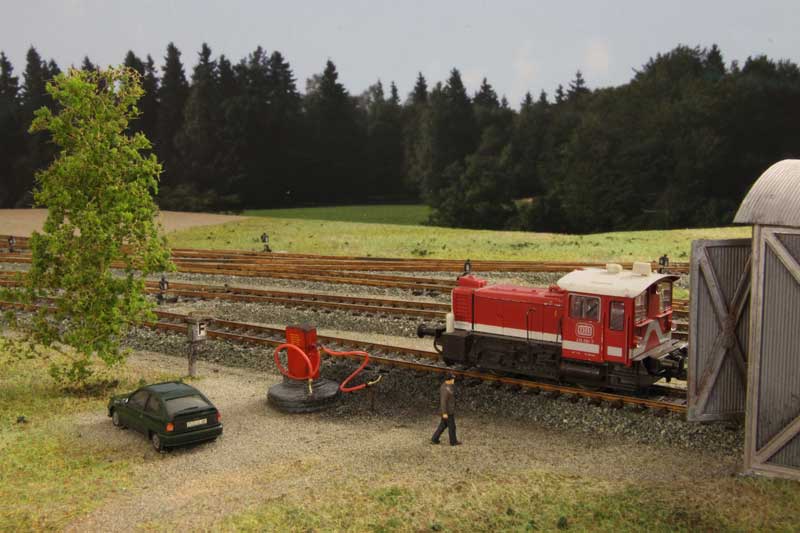 Stand am 15.11.2017: Auch der Landschaftsbau geht voran. Gegenüber dem Abzweig nach Markt Wald (Bild unten links) ist ein Köf-Lokschuppen mit einer kleinen Dieseltankstelle bereits voll durchgestaltet.