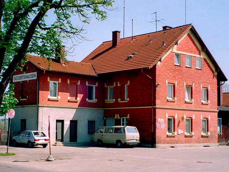 VorbildGessertshausen liegt verkehrsgünstig an der Bahnstrecke Augsburg–Ulm (KBS 980). Am 26. September 1853 wurde der Teilabschnitt Augsburg–Dinkelscherben der Bayerischen Maximiliansbahn eröffnet und in Gessertshausen ein Bahnhof an dieser Strecke errichtet. Am 1. Mai 1854 wurde schließlich die Gesamtstrecke der Maximiliansbahn von Ulm nach München fertiggestellt. Vom 12. Oktober 1910 bis zum 8. Februar 1912 wurde die von der Maximiliansbahn abzweigende Staudenbahn von Gessertshausen über Markt Wald und Ettringen nach Türkheim in mehreren Abschnitten eröffnet, womit Gessertshausen zum Eisenbahnknoten wurde. Am 24. September 1982 wurde auf dem Abschnitt von Markt Wald nach Ettringen der Personenverkehr und am 28. Mai 1983 der Güterverkehr wegen des schlechten Oberbauzustandes eingestellt und der Abschnitt stillgelegt. Am 31. Mai 1991 wurde auch der Personenverkehr zwischen Gessertshausen und Markt Wald und am 1. Mai 1996 der Güterverkehr zwischen Fischach und Markt Wald eingestellt. Anfang der 90er Jahre wurde die Trasse im Rahmen der Anhebung der Streckenhöchstgeschwindigkeit auf 200 km/h um ca. 100 m nach Norden verlegt. Damit wurde der alte Bahnhof stillgelegt und steht nun ohne Gleise da.