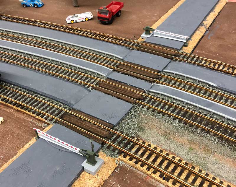 Die Schrankenanlage ist eingebaut und angeschlossen. Stand am 25.04.2018: Als Schrankenanlage für den Bahnübergang soll die 5104 von Viessmann verwendet werden. Stand am 11.04.2018: Nach der Frühjahrsausstellung gehen die Arbeiten am Bahnhof weiter. Zur Zeit ist Bodo dabei, die Beleuchtungsbirnchen der Weichenantriebe durch LED's zu ersetzen, weil diese ein "besseres Licht" machen und dabei keine Hitze abgeben. Stand am 18.02.2018: Die restlichen Dachteile sind geliefert worden und ergänzt. Sieht erwatungsgemäß gut aus !