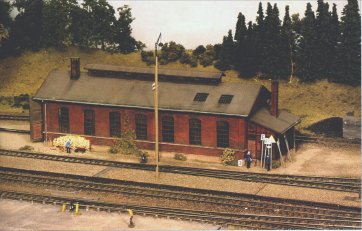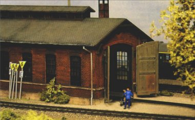 Abb.1: Der verlängerte Lokschuppen nach dem Einbau auf der Anlage. Selbst auf den zweiten Blick ist nicht mehr zu erkennen, daß dieses Modell aus zwei Bausätzen besteht. |