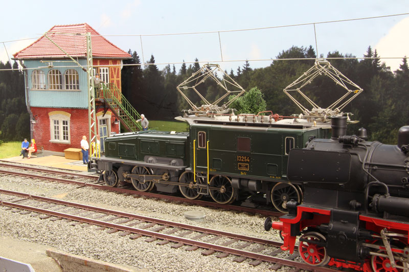 Dabei ist ein Gleis mit Oberleitung versehen, sodass auch eine E-Lok realistisch vorgeführt werden kann.